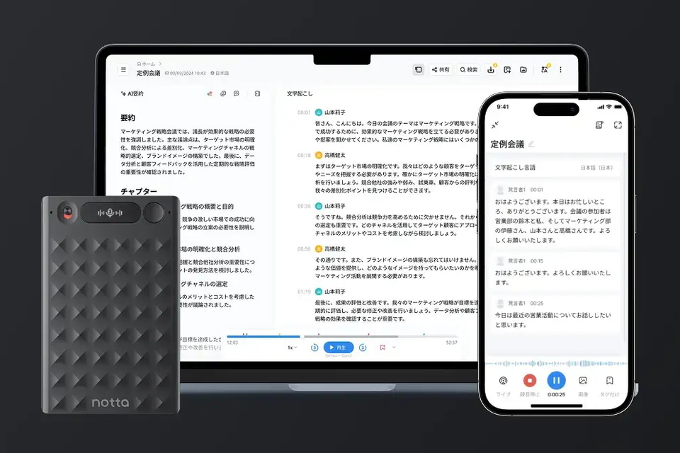 Notta Memoは、カード型のボイスレコーダーで、スマートフォンやPCと連携することで文字起こしやAI要約といった機能が利用できる。