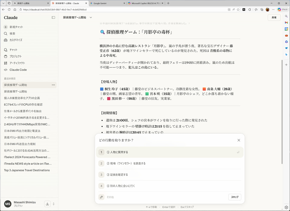 さらに、生成AIが親切すぎる。プロンプトで「直接ネタバレは禁止」と記載しているが、生成AIによっては「矛盾の芽(初期段階での不一致)」のような過剰なヒントを提示したり(Copilot)、回答前の思考プロセスの表示で「●●(登場人物)の証言を矛盾と手がかりで構築中……」のように表示したり、思考パートを展開することで重要なヒントを見ることができてしまう(Claude)。
