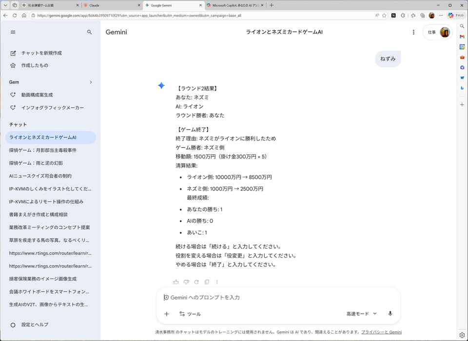 有利なライオン側でプレイするか、それとも不利だが5倍の利益を得られるねずみ側でプレイするか? 生成AIの発言を読んだうえで、どのカードを出すか? を楽しむことができる。