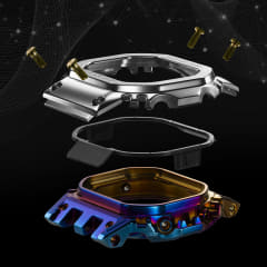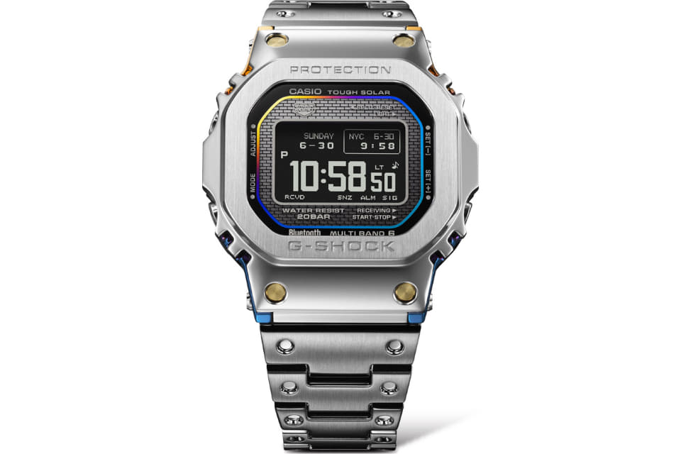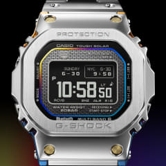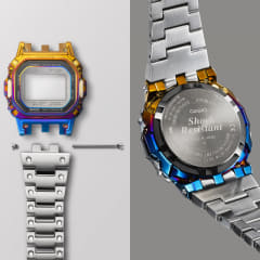 GMW-BZ5000RCは、登場以来40年以上の蓄積された耐衝撃構造データとAIの共創から生まれたジェネレーティブデザインを構造および外装設計に採用。グラデーションがかかったレインボーIPの金属製センターケースが特徴で、金色のベース加工を行ない、その後レインボーのグラデーションIPを重ねる二段階工程で、輝きあるボディを実現した。内部に弾性変形によって衝撃を吸収する樹脂製インナープロテクターを実装しており、耐衝撃性能が強化されている。