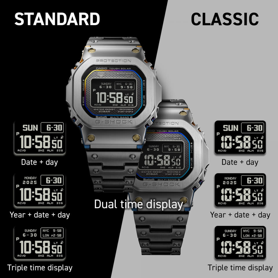 デジタル表示部には高精細なMIP液晶を搭載することで視認性が向上しており、どこでもはっきりと時刻を確認することができる。専用アプリから、メイン表示をクラシカルな7セグメントフォントへ変更することも可能。