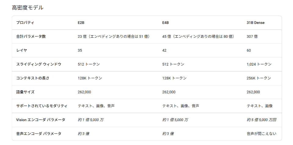 Gemma 4はそれぞれのハードウェア要件に合わせて調整されており、Google PixelやChromeなどに実装されるために構築されたE2B、E4B、サーバークラスのパフォーマンスを持つ31B、高度な推論向けに設計された26B A4Bモデルで構築されている。テキスト、画像(可変アスペクト比と解像度をサポート)、動画、そしてE2BモデルとE4Bモデルでは音声も対応している。