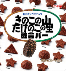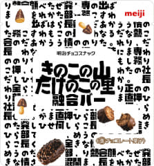「AI発案 合体しちゃった!きたきたのこのこの山里」は、「きのこの山」のカリッとしたクラッカーと、「たけのこの里」のサクッとしたクッキーを砕き、ミルク風味のチョコと小麦パフとともにバー形状に成型。ビターチョコでコーティング。それぞれの食感を1つの商品で楽しむことができる。