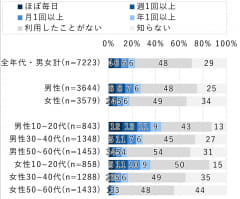 生成AIを用いたプライベートでの「対話・相談」および「動画・画像・音楽生成」に関しては、対話・相談では「ほぼ毎日」、「週1回以上」を合わせた割合が22%となっており、特に若い年齢層での利用が進んでいる。また、男女比では全年齢層では男性の方がAIで相談している比率が高い傾向にあるが、若年層では男女分け隔て無く利用しているデータとなっている。