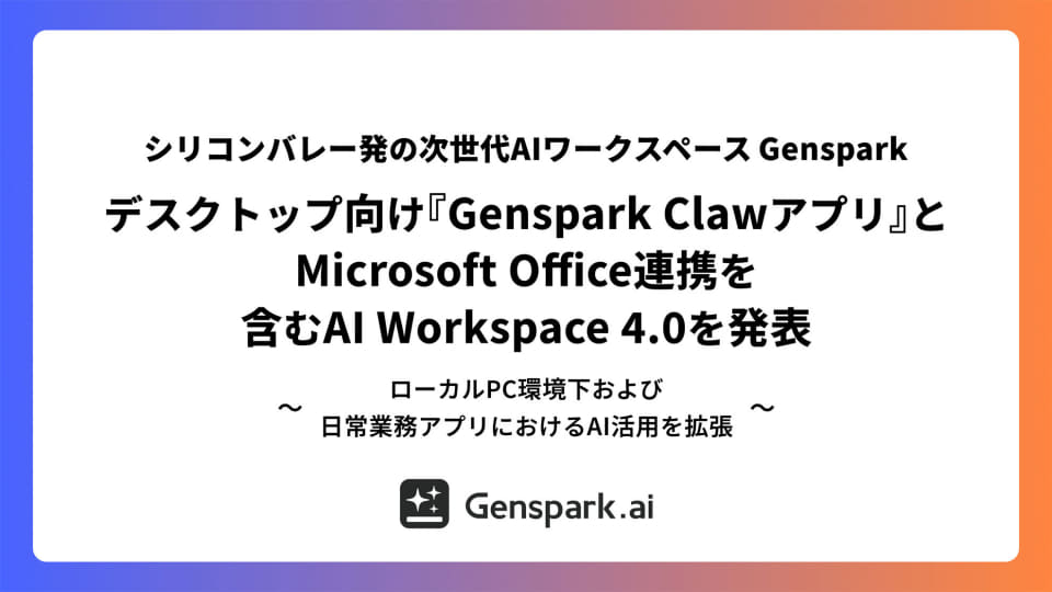 ジェンスパークは、「Genspark AI ワークスペース 4.0」を発表するとともに、ローカルコンピュータ環境下で「Genspark Claw」を利用可能となる「Genspark Clawアプリ」の提供を開始すると発表した。また、Microsoft Officeアプリ内でジェンスパークが利用可能になる。