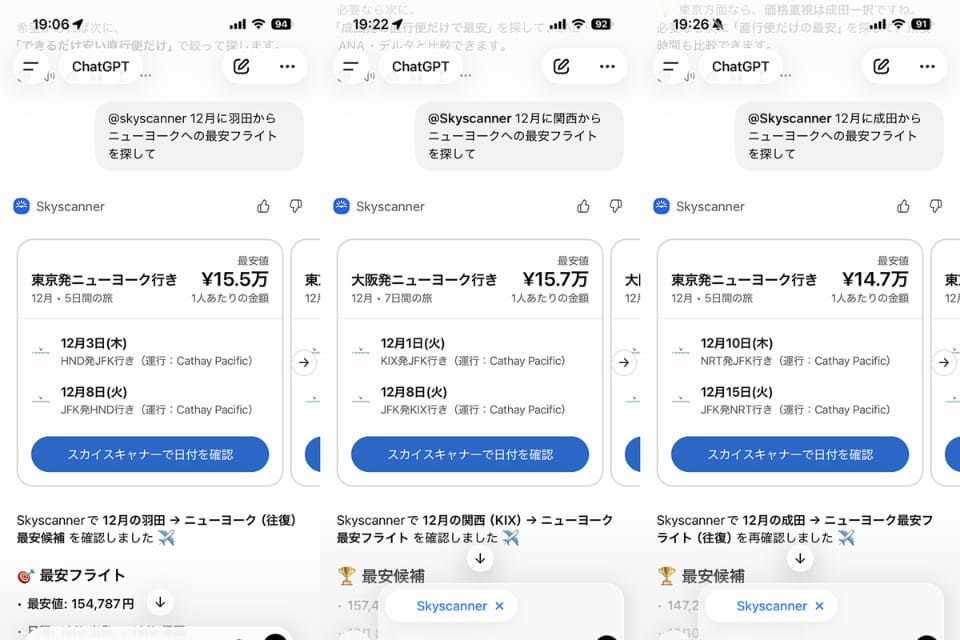 ChatGPTでは、アプリ画面からライフスタイルを選択。検索バーで「Sk」と入力すると最上段に表示され、「接続する」をタップすると使用可能に。「@skyscanner 12月にニューヨークへの最安フライトを探して」のように入力・会話するだけで、Skyscannerの検索ロジック・価格情報をもとに、世界中のフライトと料金の選択肢がリストアップされる。