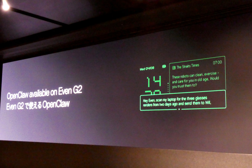 同氏によれば、Even Hubではすでに数十種類のアプリが提供されており、さらに何百ものアプリが承認を待っている状態だという。F501iの時代との大きな違いは、実用性の高いエージェンティックAIが活用できるところにあり、同氏は「私自身、オフィスのMac miniでOpenClawエージェントを動かしており、それを今もグラスに接続している。何か急ぎの話があればグラスに知らせてくれるし、短いコマンドを出すこともでき、本当に便利」と語る。