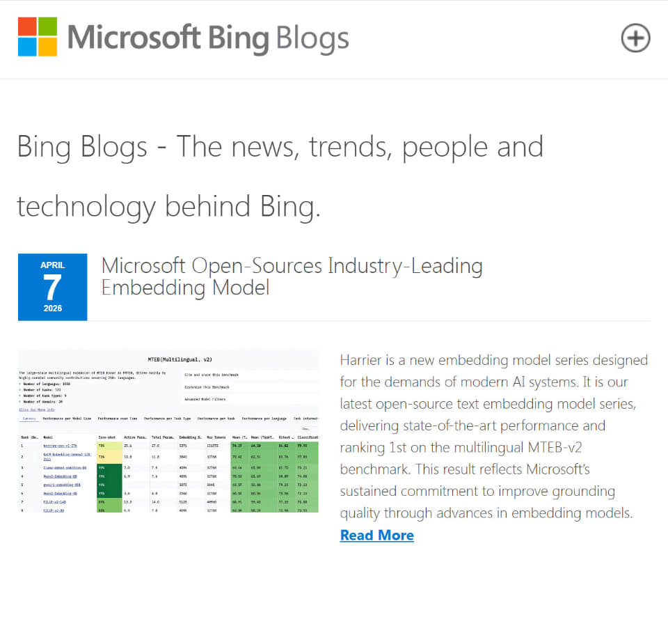 MicrosoftのBingチームは4月7日、新しいオープンソースの埋め込みモデル「Harrier」を発表した。