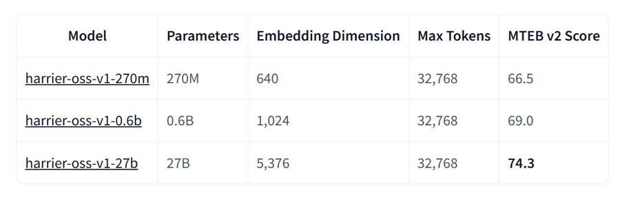 「Harrier」は、Harrier-OSS-v1-27B、Harrier-OSS-v1-0.6b、Harrier-OSS-v1-270mの3つのサイズで提供される。
