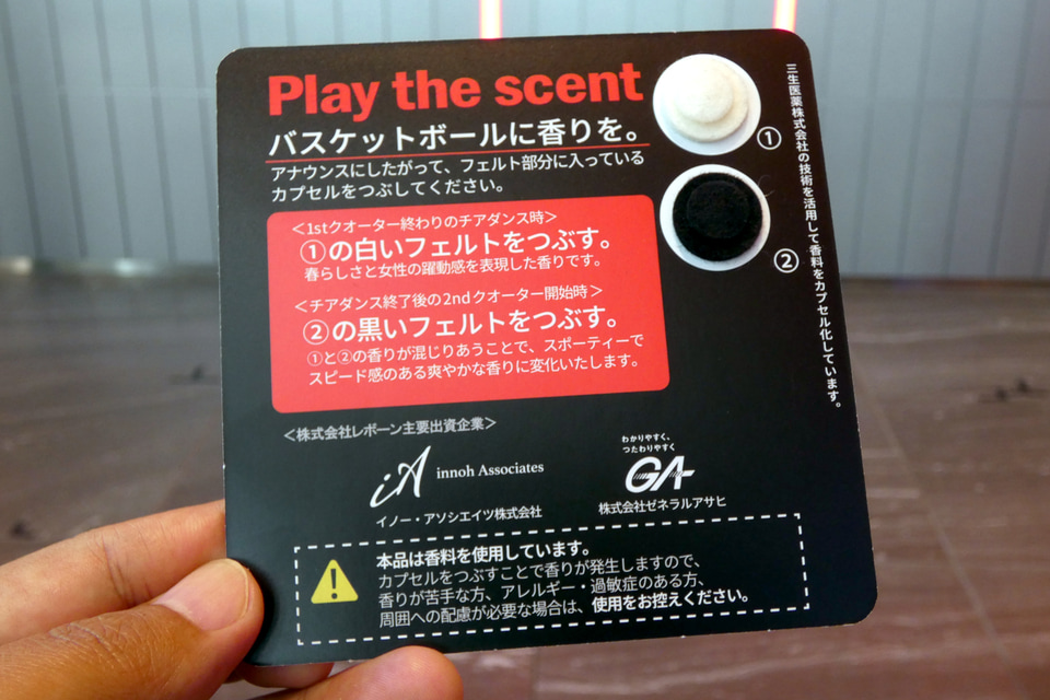 また、2種類の香りカプセル付きのオリジナルカードを配布。アルバルク チアリーダーによるパフォーマンスにあわせて1つ目のカプセルを潰し、ダンスをイメージした香りを演出。パフォーマンス終了後に2つ目のカプセルを潰すことで、試合再開に向けてスポーティーでスピード感のある爽やかな香りを演出することで、観客の感情を揺さぶっていく。