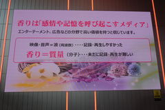松岡氏は、香りが人々に与える影響について、「私たちの生活はデジタル化され、視覚や聴覚の情報は溢れている。五感情報の中で唯一本能に直接的に働きかける感覚が嗅覚で、特定の香りを嗅いだ瞬間、昔の記憶が鮮明に蘇るプルースト効果は皆さんご経験があると思う。香りは情動を動かす最強のスイッチ」とした上で、「この素晴らしい力を持つ香りは、これまでビジネスやテクノロジーの文脈では再現性がない、曖昧なものとして扱われてきた。私たちはここでデジタルの力で解き明かしたい」として、自社の取り組みを紹介する。