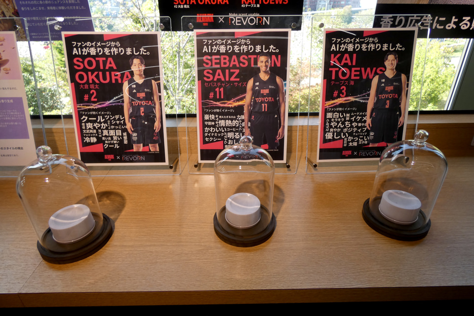 具体的には、ファンから募集した大倉颯太、テーブス海、セバスチャン・サイズの3選手のイメージに基づき、各選手の香りをAIが生成。来場者が各選手の個性を香りとして体感できるようにした。ちなみに、実際に3選手の香りを嗅いでみると、決して汗臭くはなく、心地よい爽やかな香りとして表現されていた。