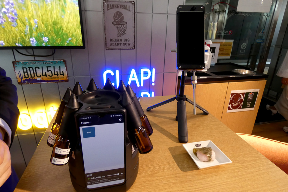 そして、8つの香料カートリッジを備えた匂い再現デバイスの「Hearom(ヒアロム)」では、レシピに沿ってセミオートで香りを噴霧。時間軸にあわせて香りを変化させ、映像や音楽にあわせて香りを楽しめるような環境を演出できるようにしている。