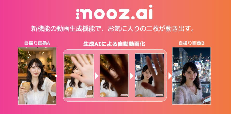 GAIWAYAは、AI画像生成アプリ「mooz.ai」において、生成した2枚の画像2枚から選択した写真の間を自然につなぐショート動画を自動生成する機能アップデートを行なった。