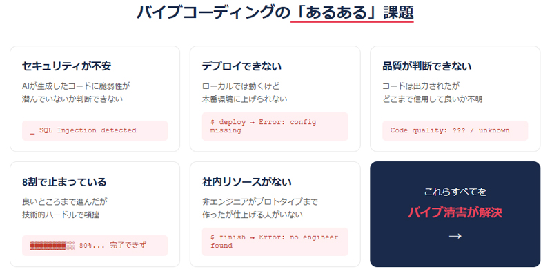 バイブコーディングで最も多い課題が「完成したけどサーバーに上げられない」「本番環境で動かない」というもの。同社はコードの仕上げからサーバーへのデプロイ、継続的なホスティングまでワンストップで対応。