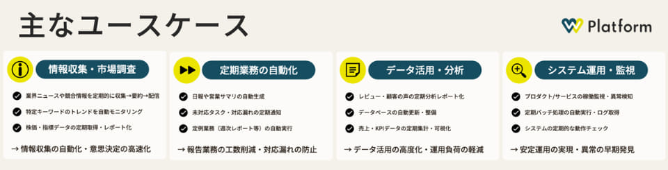 トリガー機能は、あらかじめ設定したスケジュールに沿って、AIエージェントを自動起動する機能。例えば、次のような定期的に発生する業務を自動化できる。