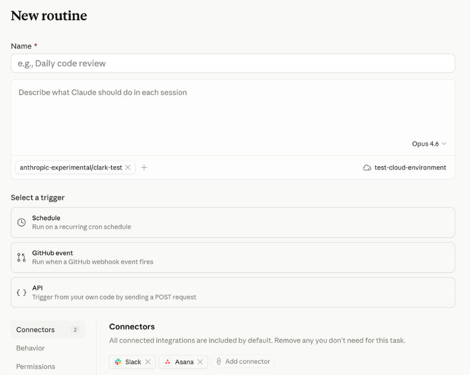 Configure a routine once (a prompt, a repo, and your connectors), and it can run on a schedule, from an API call, or in response to an event.