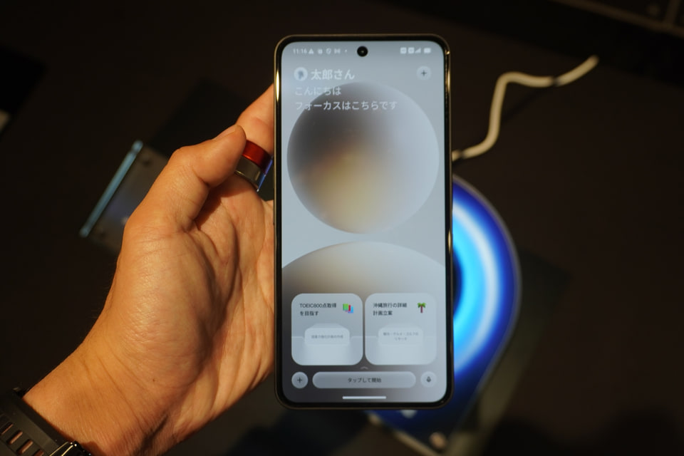 「Generative Interface」はアプリを切り替えずに情報を取得し、最適なUIを動的に生成する技術となる。本体右側面には白いAIボタンを搭載し、押すとNatural AIが起動して画面の内容を読み取り、次のアクションを提案する。Androidの通常のホーム画面とは別に、中長期的な目標を管理する「FocusSpace」画面も用意した。資格取得の学習計画や旅行の準備など、継続的なタスクを段階的に支援する。