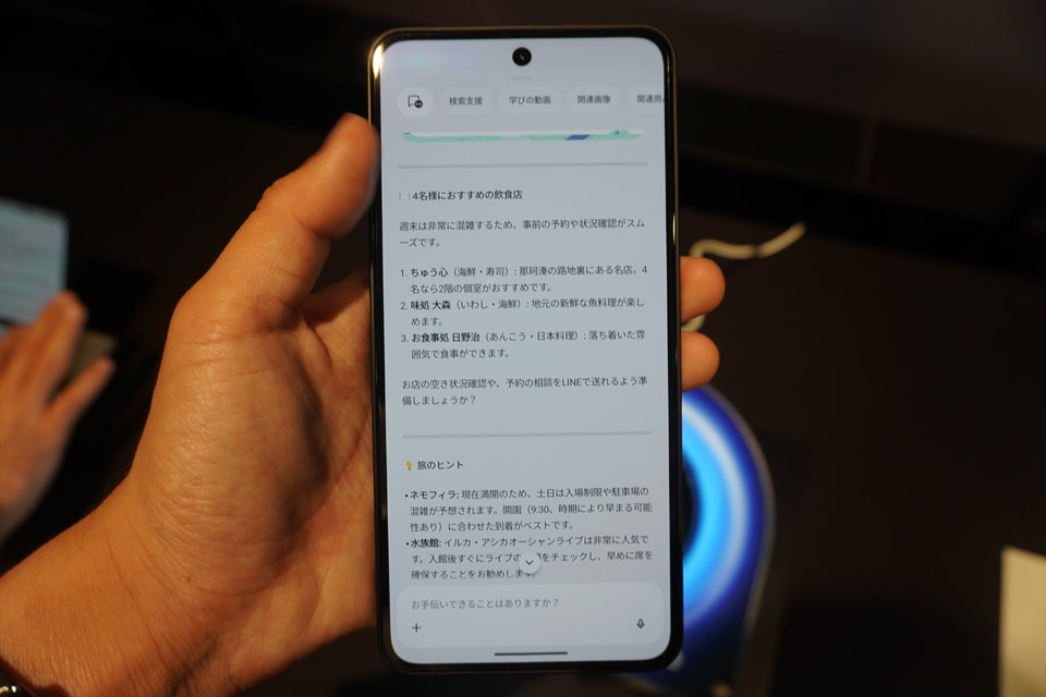ただし、Natural AIのアプリ操作はAPI連携で実現している。nubiaの「nubia M153」のようにアプリのUIを画面認識して自動タップする方式とは異なり、アプリ側にAPIが用意されている必要がある。対応アプリは現時点でGmail、Googleマップ、Googleカレンダー、YouTube、LINE、食べログ、Amazon、楽天市場、Yahoo!ショッピングの9つで、順次拡大する予定だ。