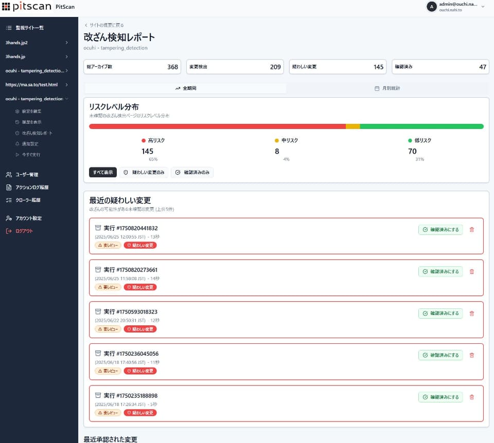 「PitScan」では、Webサイトの変更差分をAIが解析し、改ざんリスクを自動判定する。改ざんの検知からリスク判定、遮断といった初動対応までを一体化している。