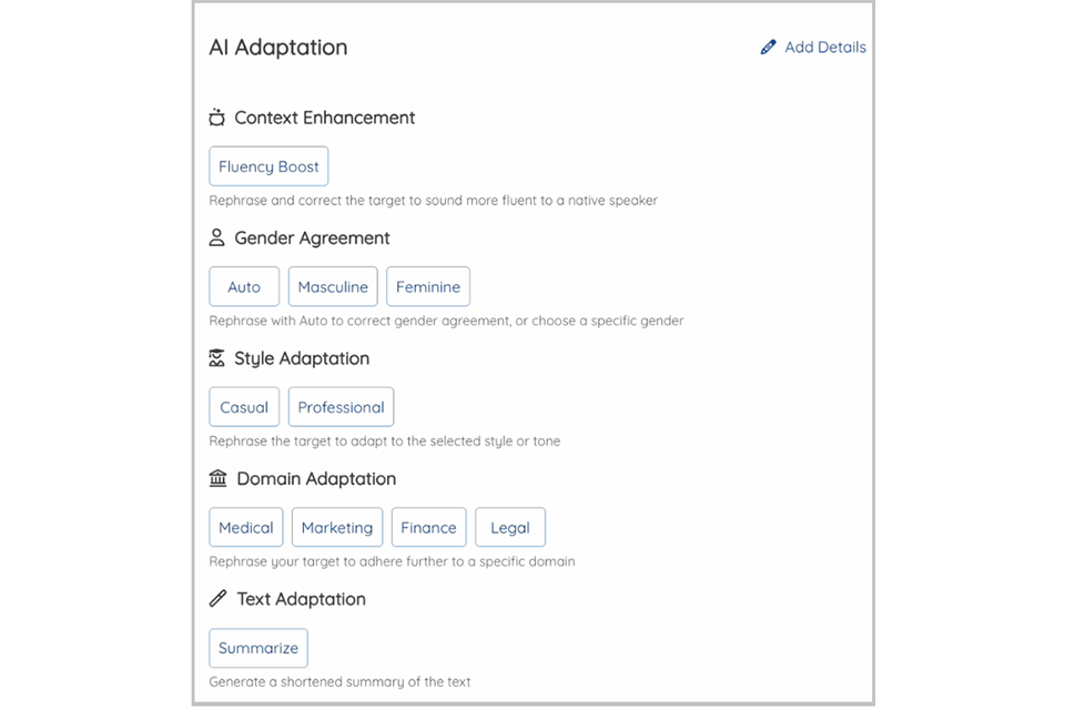 生成AIによる補完・調整に対応する言語は4月17日現在、英語・フランス語・ドイツ語・イタリア語・スペイン語の5言語。7月には日本語を含む20言語の追加アップデートを予定している。