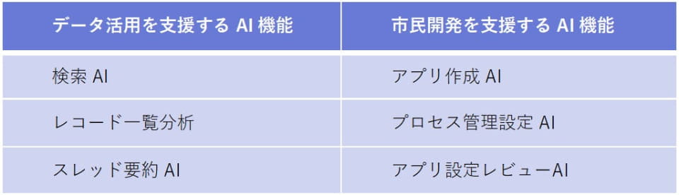 kintoneには、アクセス権・変更履歴など管理された業務アプリ上に、業務データが蓄積されていっている。これらの業務データを活用するためのAI機能が提供される。また、現場主体で業務アプリを作成できるだけでなく、IT部門が安心して運用できるガバナンスも兼ね備えており、市民開発をさらに広げるためのAI機能が提供されている。