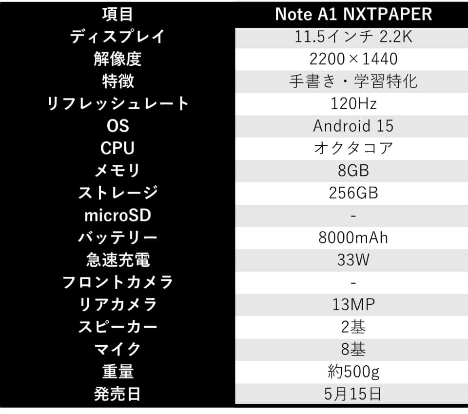 ディスプレイは、11.5インチで解像度は2,200×1,440ドット、リフレッシュレートは120Hz。CPUはオクタコア。メモリは8GBで、ストレージは256GB。バッテリーは800mAh。OSはAndroid 15。重量は約500gとなっている。