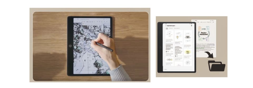 「Note A1 NXTPAPER」は紙に書くような自然な書き心地を追求。反射や映り込みを抑えたディスプレイ技術「NXTPAPER Pure」を採用。T-Pen ProとAI機能を組み合わせ、手書きメモをテキスト化し要約、翻訳もしてくれる。