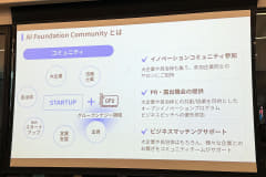 そういった中で、技術的なイノベーションを起こしそうなAI技術を持っていたりAI関連サービスを実現できそうなユニコーン企業でありながらAI計算基盤を利用できずにいる状況も見られることから、WeWork Japanの持つコミュニティと大企業や地方自治体とのマッチングから、法務などのバックアップ、そしてソフトバンクの持つAI計算基盤の利用まで一気通貫で利用することで、ビジネスを立ち上げることを目的としたのが「AI Foundation Community」となる。