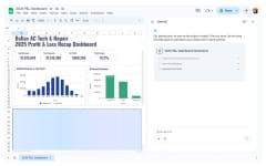 例えばGeminiに、「過去のサービスインシデントと料金表を活用して損益や売上目標の進捗、利益率などを構築して」とEnd-to-Endの作成を依頼したり、「売上と在庫データの上にスコアカードと棒グラフを追加して」と編集を依頼することができる。