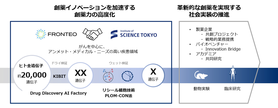 この拠点では、FRONTEOの方程式駆動型AI「KIBIT」と、東京科学大学が有する「PLOM-CON解析法」や「リシール細胞技術」といった先端技術を融合させ、仮説生成から実験検証まで一気通貫で行えるようになる。