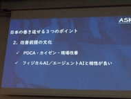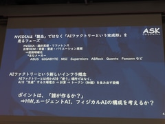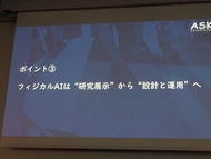 最後のポイントがフィジカルAIであり、“研究展示”から“設計と運用”へとフェーズが移り変わった。アスクもフィジカルAIのノウハウが溜まってきており、さまざまなサポートができると考えている。