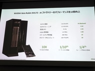GTC 2026は1000を超える技術セッションやワークショップなどが行なわれ、史上最大規模となった。日本からは800人以上が現地参加した。全体的なテーマは、学習から推論へということと、エージェントAIが実用になってきたということ、そしてオープン化である。NVIDIAはAIのインフラ企業であり、AIインフラは5つのレイヤーから成り立っている。一番下がエネルギー、その上にチップがあり、その上にインフラ、モデル、アプリケーションが構築されている。推論ではトークンコストを下げることが重要だが、最新のGB300 NVL72では従来に比べて50倍の電力あたりスループットを実現し、トークンコストを1/35にすることができる。また、AIファクトリー向けの次世代製品であるVera Rubin NVL72は、Blackwellと比べてNVFP4の性能が5倍に向上しており、電力あたりの性能は10倍に向上している。