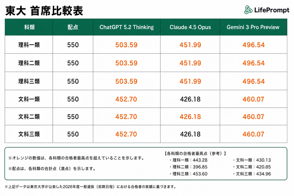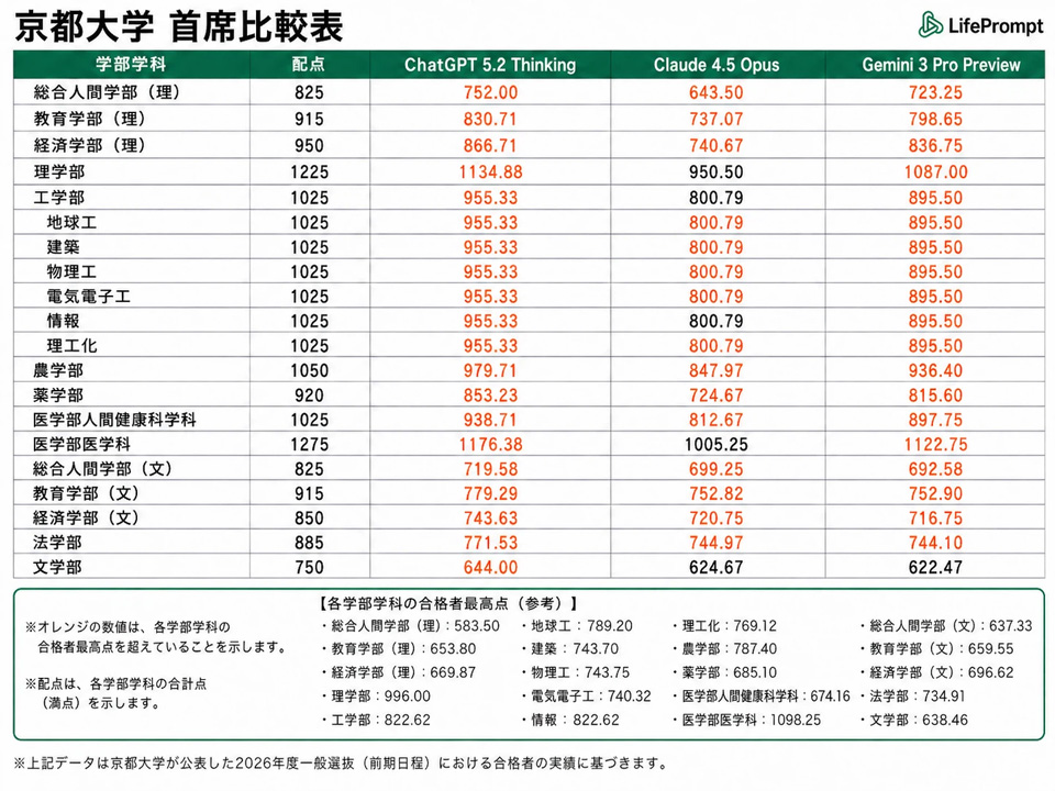 河合塾講師とKIESが採点した結果、ChatGPT 5.2 ThinkingとGemini 3 Pro Previewは、東京大学のすべての科類および京都大学のほぼ全学部・学科において合格者最高点(首席相当)を上回った。数学を中心に複数の科目で満点を記録した。