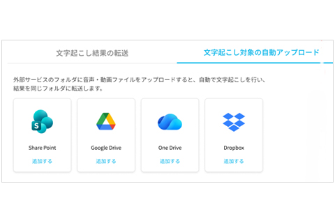 クラウド上の指定フォルダに保存された音声・動画ファイルを自動的に文字起こしする機能を追加。会議の録画データをクラウドの指定フォルダに保存するだけで、自動的に文字起こしを開始し、指定した場所に結果を保存する。手動アップロードの作業が不要になり、業務効率が加速するという。